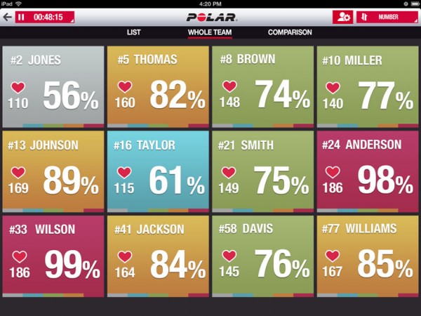 Η εφαρμογή Polar Team app αποτελεί έναν εύκολο τρόπο να παρακολουθήσετε σε πραγματικό χρόνο κατά την διάρκεια της προπόνησης την καρδιακή συχνότητα των παικτών σας. Το app εμφανίζει με ακρίβεια τις καρδιακές συχνότητες της ομάδας που θα σας βοηθήσουν να καθοδηγήσετε καλύτερα τους παίκτες σας. Μπορείτε να αναλύσετε τη φυσική τους κατάσταση, να δείτε ποιος κουράζεται, να ελέγξετε την απόδοσή τους σε πραγματικό χρόνο και να δείτε ποιος έχει ακόμα αποθέματα ενέργειας. Με την εφαρμογή αυτή μπορείτε να έχετε την ομάδα με την καλύτερη φυσική κατάσταση στο πρωτάθλημα.